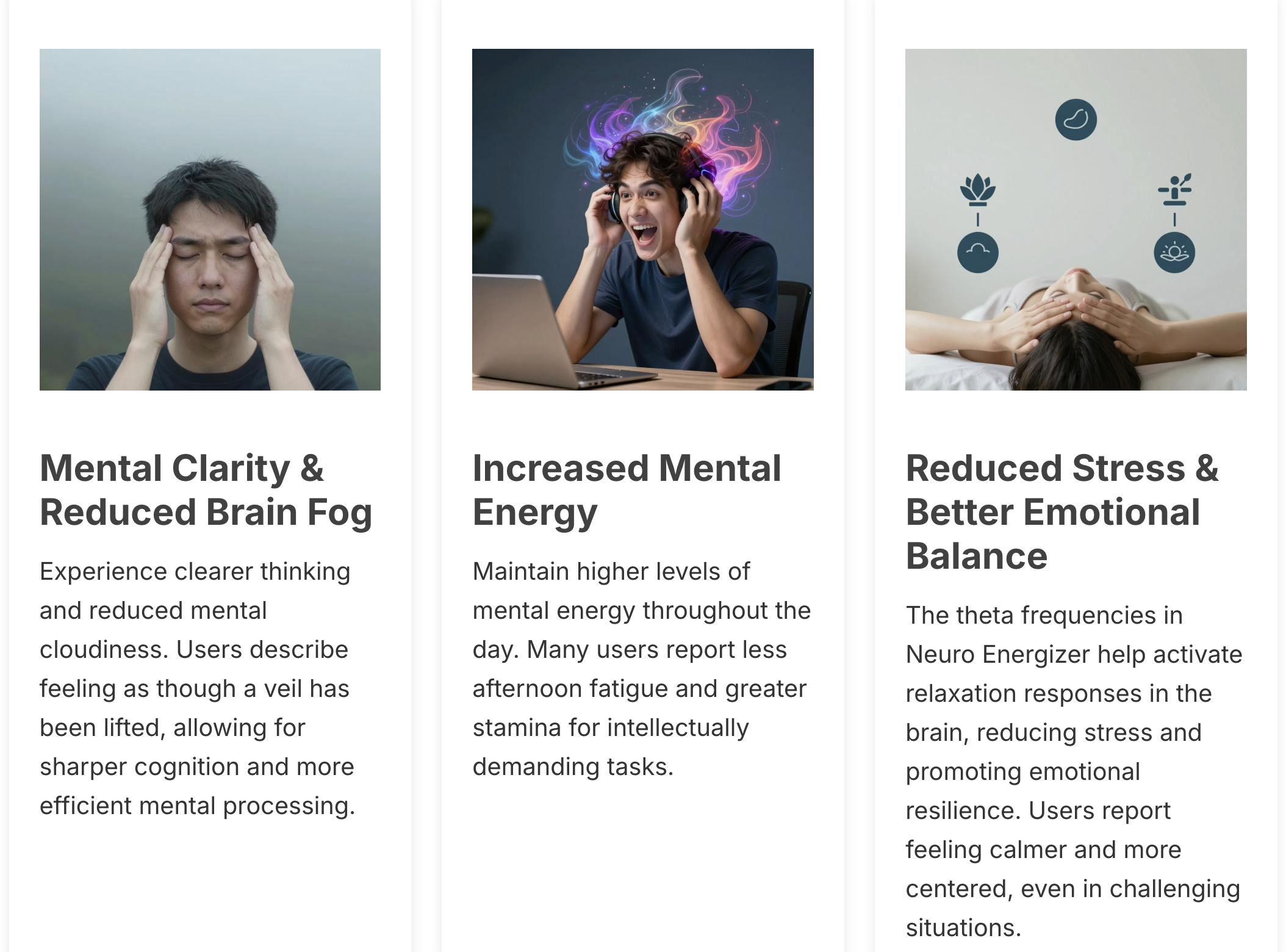 Neuro Energizer uses completely natural sound-based technology with no known side effects. Unlike supplements or medications, it doesn't introduce any chemicals into your body – it simply uses sound frequencies to guide your brain into beneficial states.